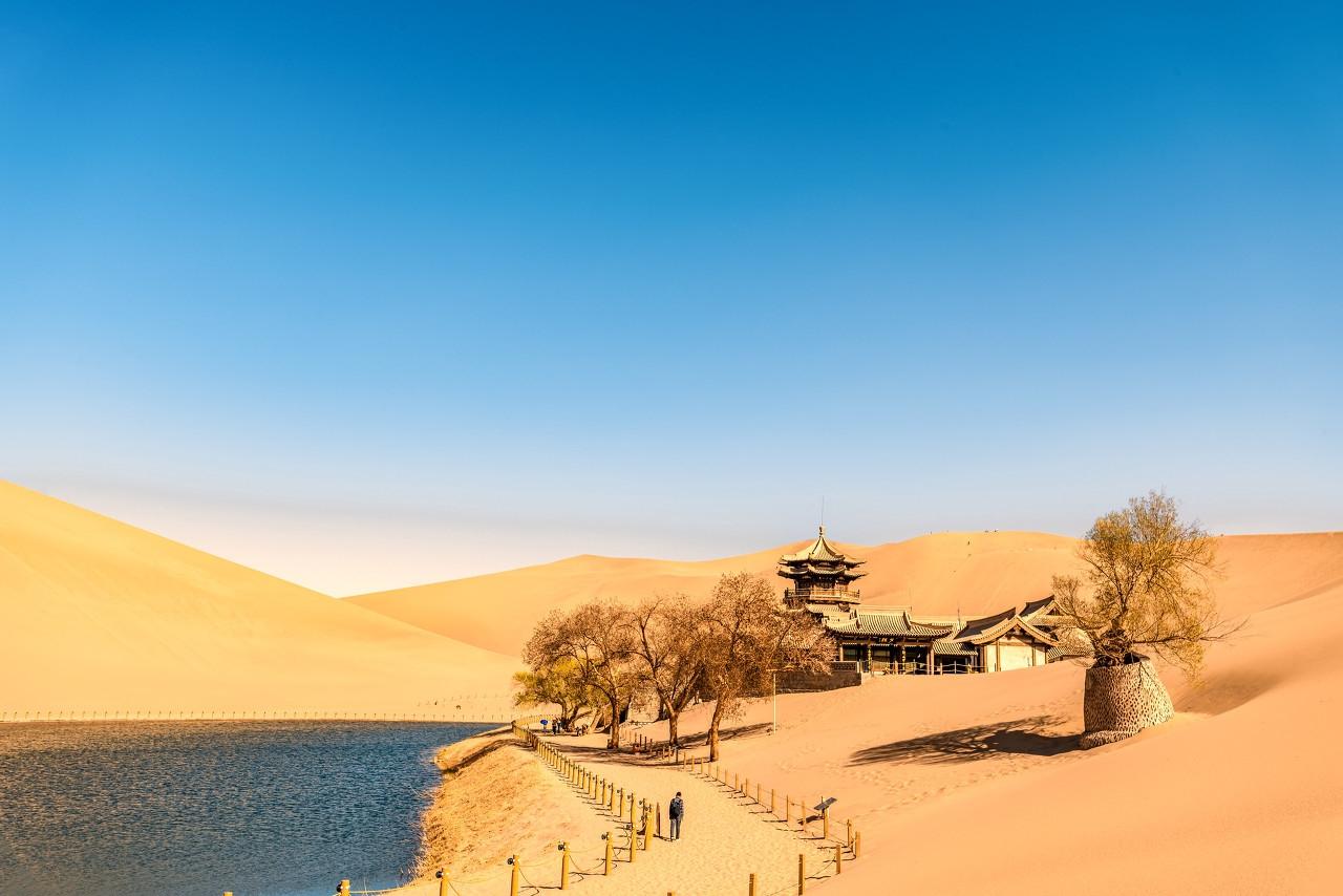 2、月牙泉:月牙泉是沙漠中的一片綠洲,泉水清澈甘甜,四周綠樹成蔭,景色宜人,您可以感受到沙漠與綠洲的交融之美。
